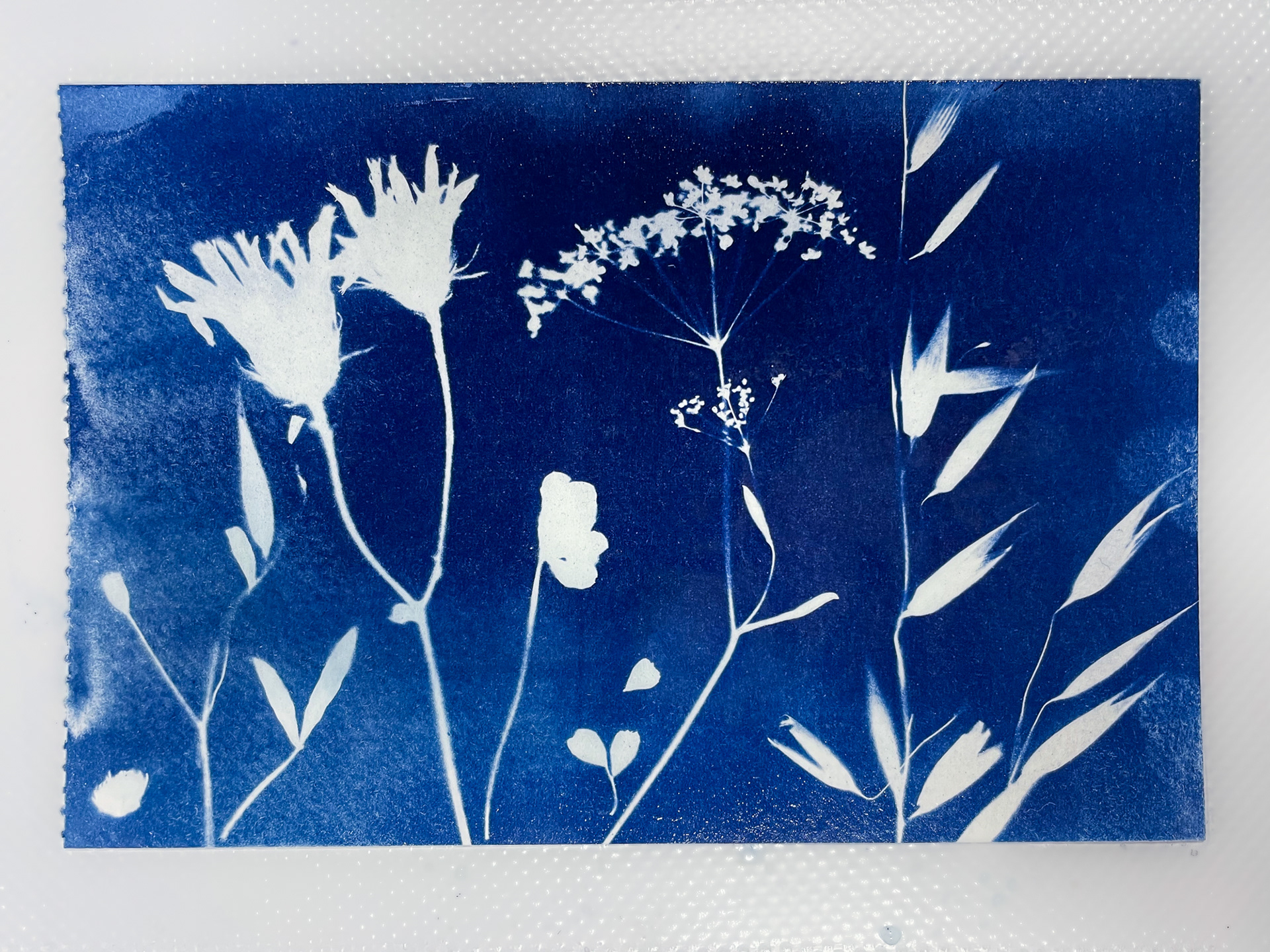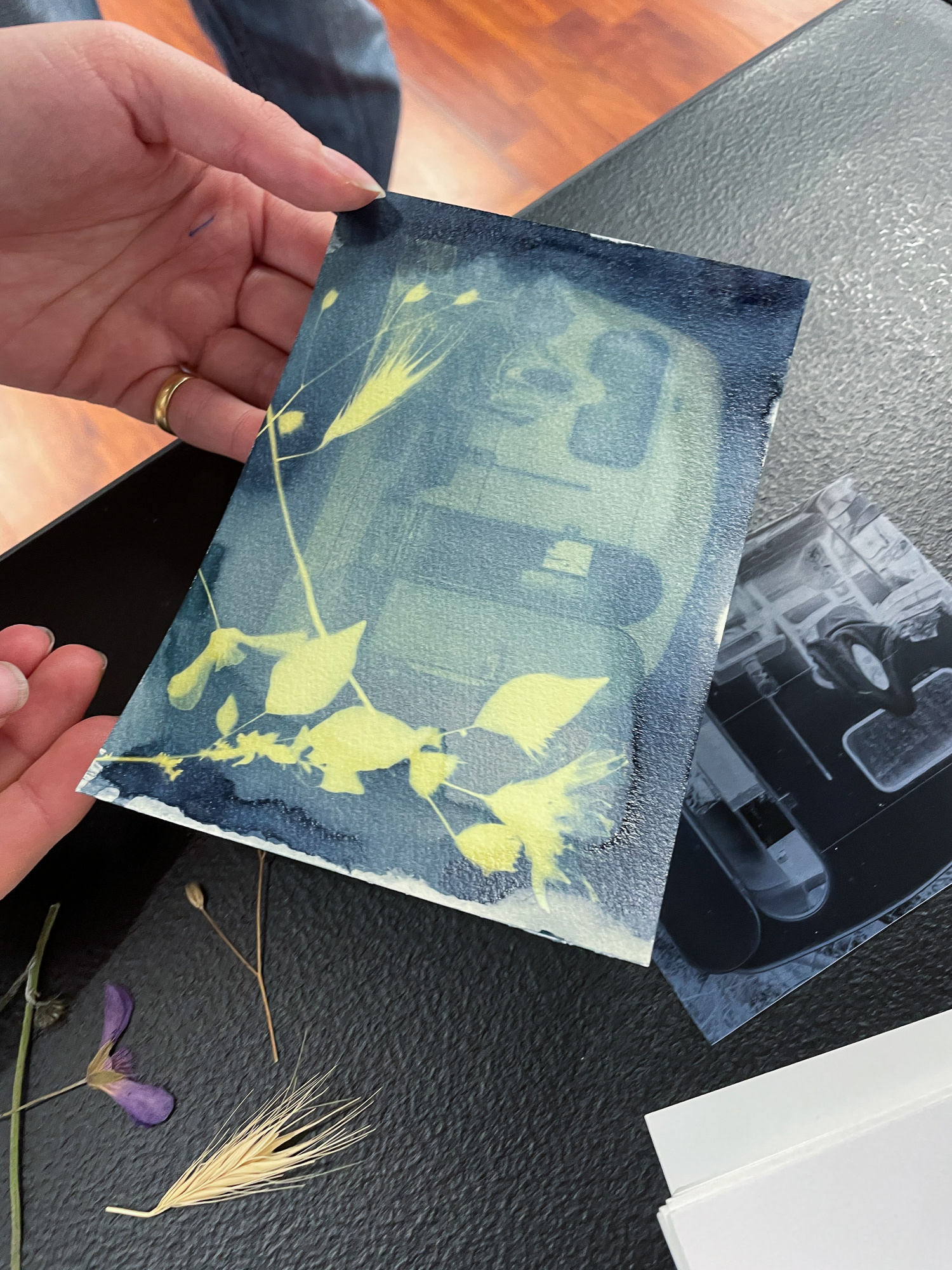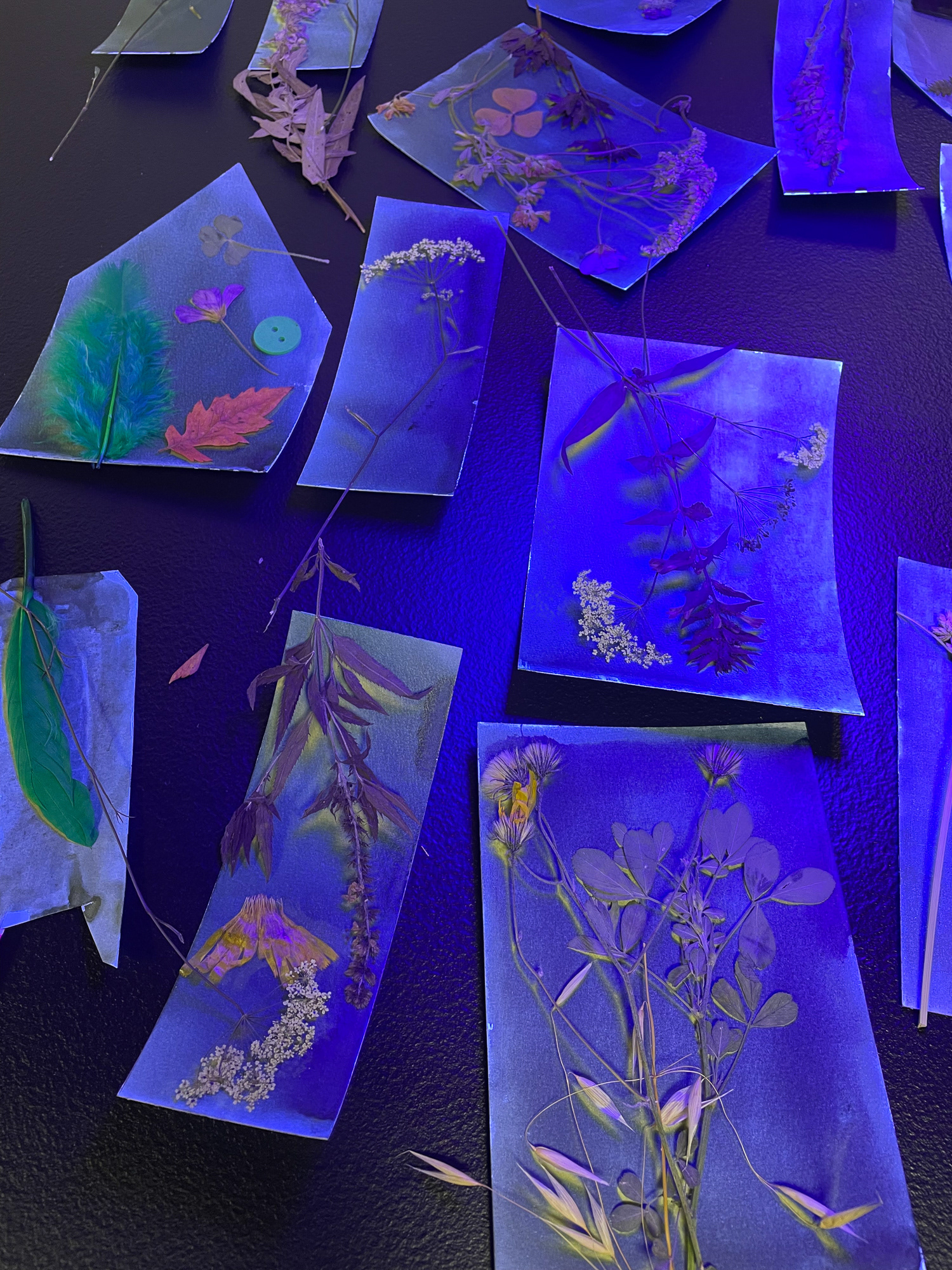 Dans le cadre de mon exposition à la Micro-Folie de Falaise, j’ai animé plusieurs ateliers invitant les participant·es à découvrir la magie du cyanotype, une technique photographique ancienne permettant de créer des images sans appareil photo.