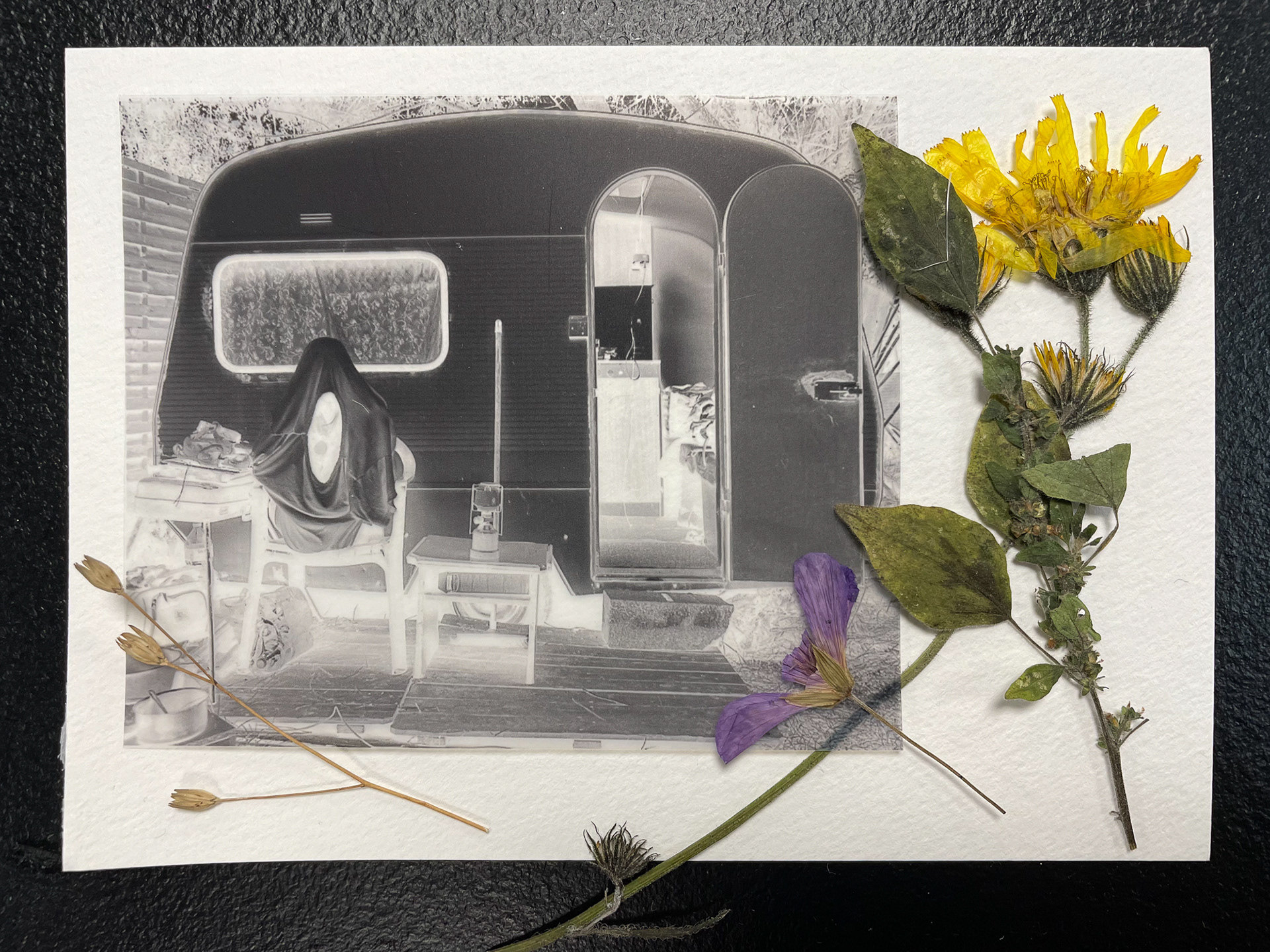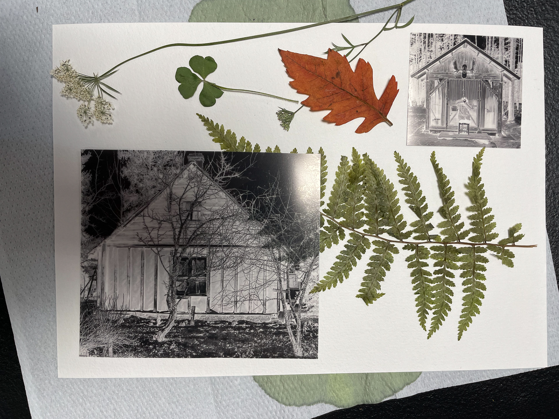 En lien direct avec l’exposition, nous avons exploré le thème « habiter » à travers différentes matières visuelles : découpes en papier, plantes séchées, mais aussi à partir des négatifs de certaines photographies présentées dans l’espace d’exposition. Ces éléments ont permis à chacun·e de composer des paysages imaginaires ou de réinterpréter des fragments des images exposées.